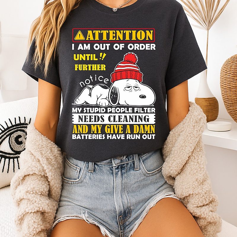 Snoopy Attention I Am Out Of Order Until Further Notice My Stupid People Filter Needs Cleaning T-Shirt is trending online now. Check out the t-shirt below!